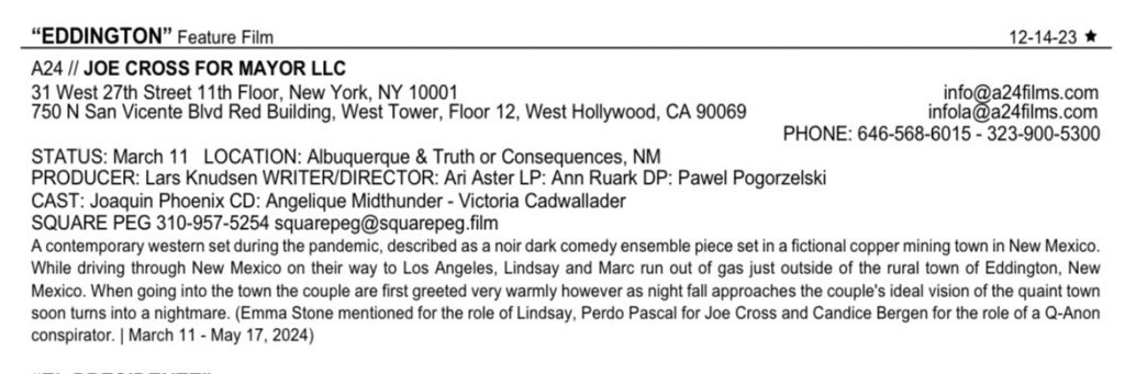 “Eddington” de Ari Aster está programado para iniciar a produção em 11 de março em Albuquerque. As informações são da Production Weekly. O filme, que será estrelado por Emma Stone, Joaquin Phoenix e Pedro Pascal, é um faroeste que se passa durante a pandemia. Está sendo descrito como um “filme conjunto”. Há rumores de que Candice Bergen também fará parte do elenco.